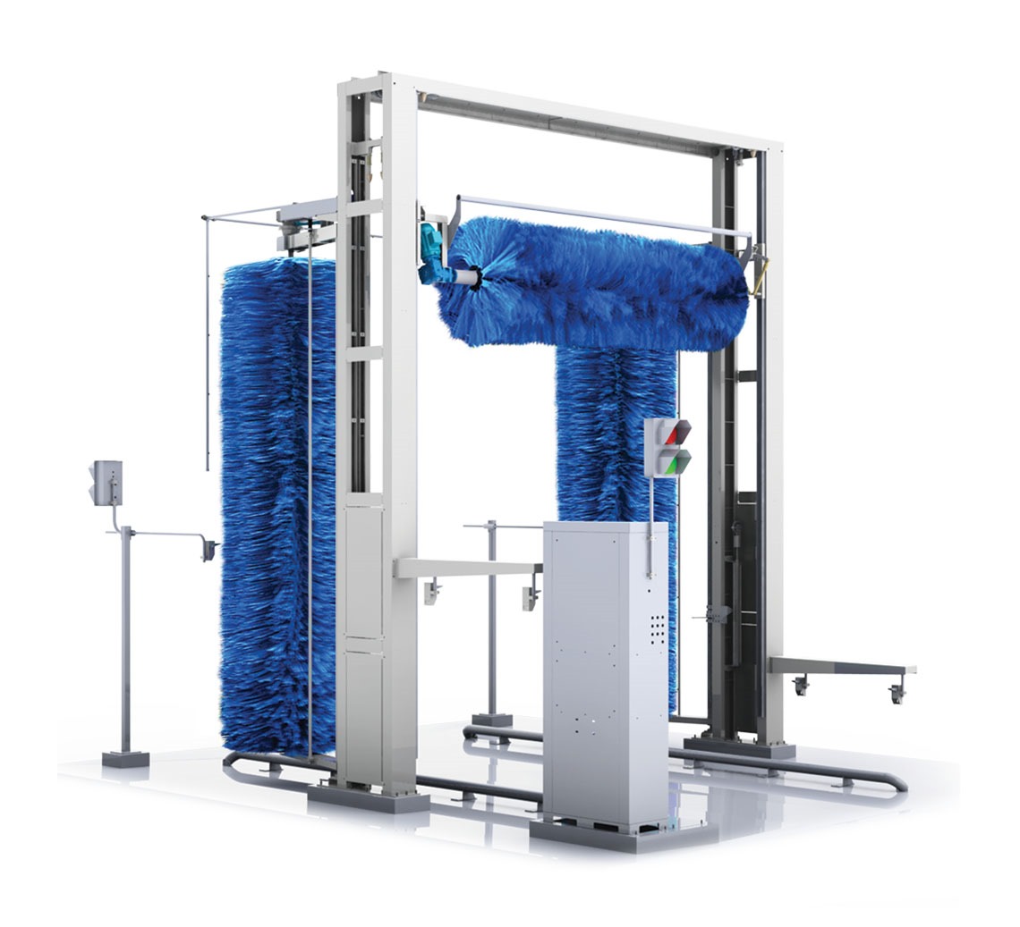 Equipamento fixo com 3 ou 5 escovas, sendo uma escova horizontal para a lavagem do teto e traseira do veículo e 2 ou 4 escovas verticais para lavar as laterais do veículo.